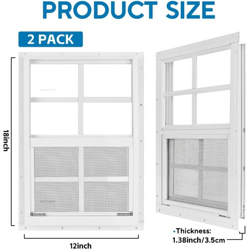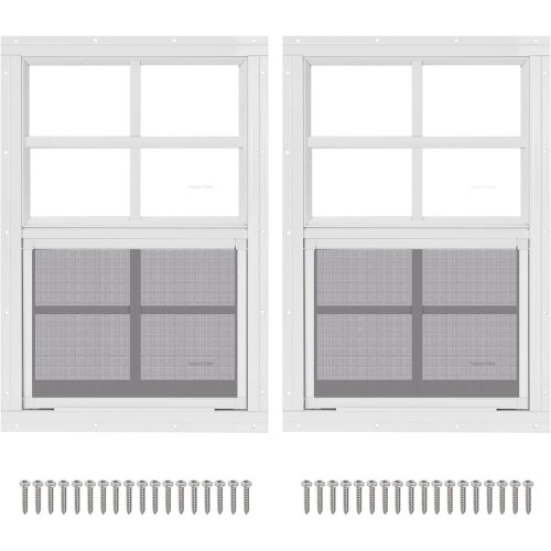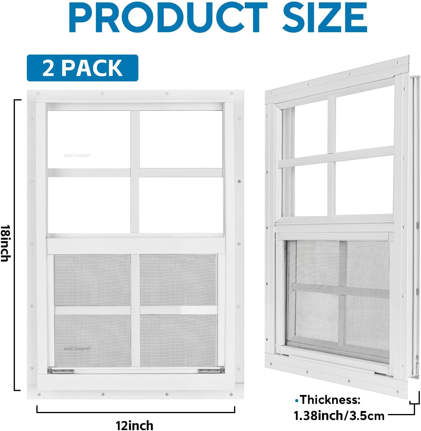 2 Pack 12" x 18" White Shed Window with Tempered Glass and Fiberglass Screen Household Sliding Windows with Screws for Shed, Chicken Coop, Playhouse, Garage and Barns